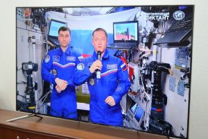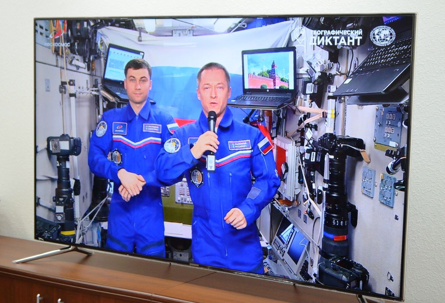 Затем ребята прошли в конференц-зал, где их ожидало видеообращение с приветственными словами российских космонавтов прямо с орбиты – Сергея Рыжикова и Алексея Зубрицкого, пожелавших всем участникам Диктанта удачи. После этого замечательного старта, ребята приступили к просмотру презентации с вопросами по географии и истории географических открытий. Озвучивали эти вопросы известные личности: актёр и режиссёр сербского происхождения Петар Зекавица, ведущий крупнейшего в СНГ канала о технологичном образе жизни Валентин Петухов, телеведущий Станислав Натанзон (автор авторского телешоу «Погнали!»), Федерико Арнальди (ведущий программы «Поедем, поедим!» на НТВ), актриса Ксения Теплова и актёр Дмитрий Чеботарев.