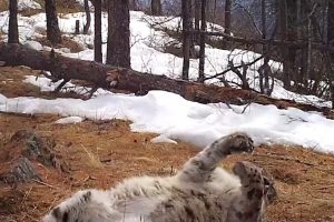 Весенняя экспедиция сотрудников отдела науки Объединённой дирекции и представителей Хакасского республиканского отделения Русского географического общества на территорию Саяно-Шушенского заповедника принесла новые материалы о снежном барсе. На одном из видео самец по кличке Опер после плотной трапезы решил насладиться сладким сном. Комфортно устроившись напротив установленной фотоловушки, он лениво потягивается и переваливается с боку на бок.