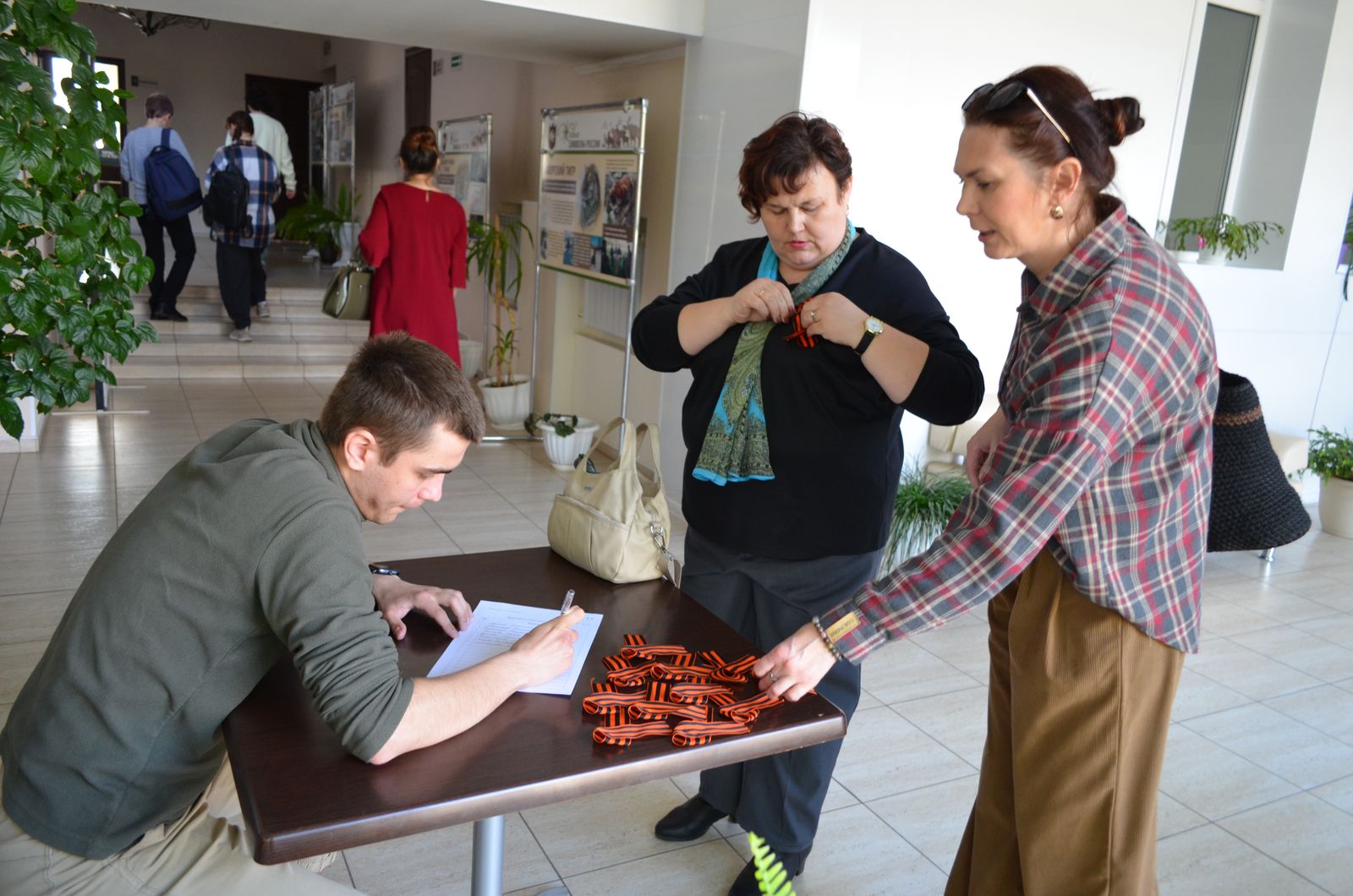 Встречая гостей, организаторы проводили регистрацию участников и вручали каждому символ воинской славы России и народной памяти – георгиевскую ленту.