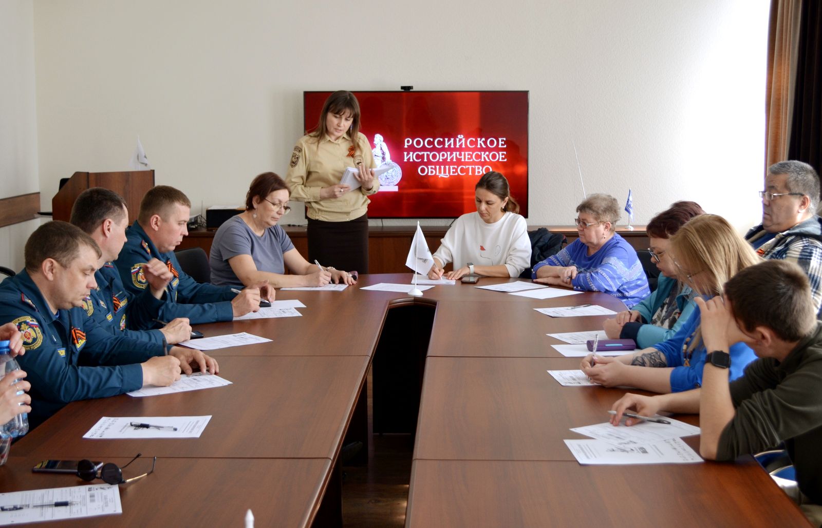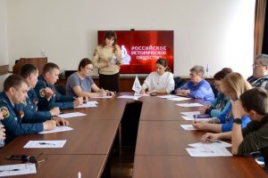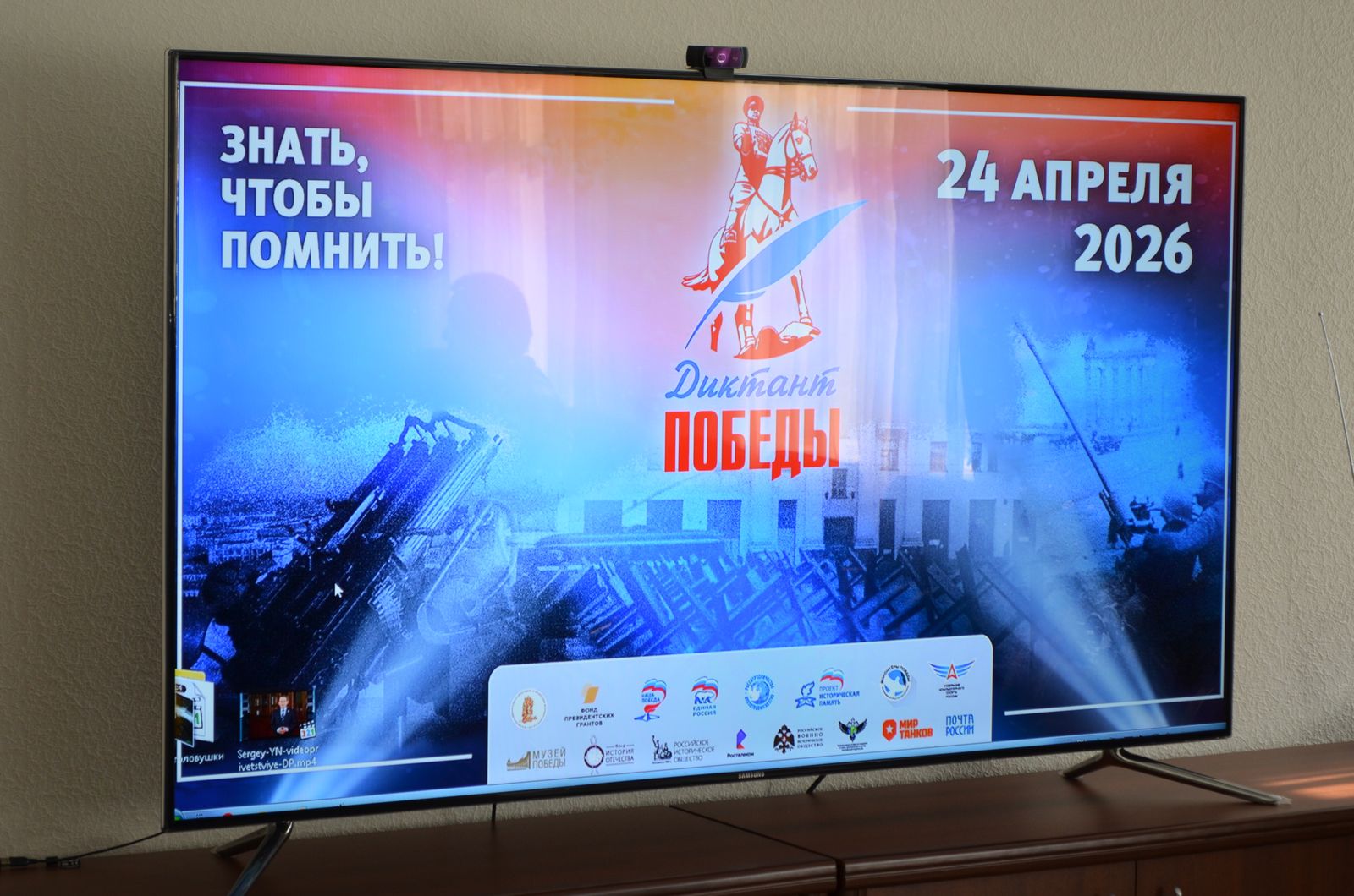 Перед началом написания «Диктанта Победы» в конференц-зале состоялся показ приветственного видеоролика. С телеэкрана к участникам мероприятия обратился Председатель Российского исторического общества Сергей Нарышкин. Он подчеркнул, что участие в «Диктанте Победы» – это не просто проверка знаний, а прежде всего гражданский поступок и личный вклад в защиту исторической правды. Сергей Нарышкин пожелал всем удачи в написании Диктанта и отметил важность сохранения памяти о событиях тех лет для будущих поколений. Затем сотрудники Дирекции рассказали участникам о правилах заполнения бланков ответов.