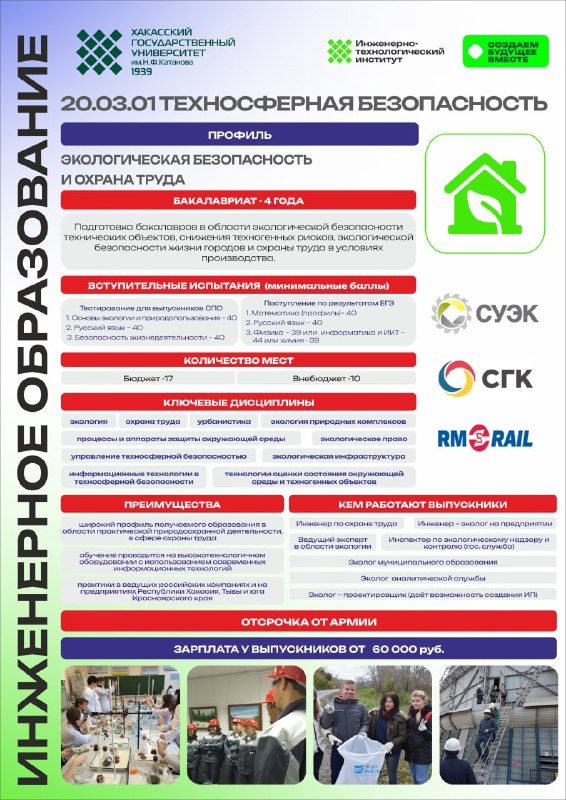 Приглашаем к нам новых студентов на направление подготовки «Техносферная безопасность» (профиль: Экологическая безопасность и охрана труда). В 2025 году на направление подготовки выделены следующие контрольные цифры приема: целевое обучение 1 место, особая и отдельная квота 4 места, бюджетные места в рамках общего конкурса 12 мест, по договорам об оказании платных образовательных услуг 10 мест, ИТОГО 27 мест.