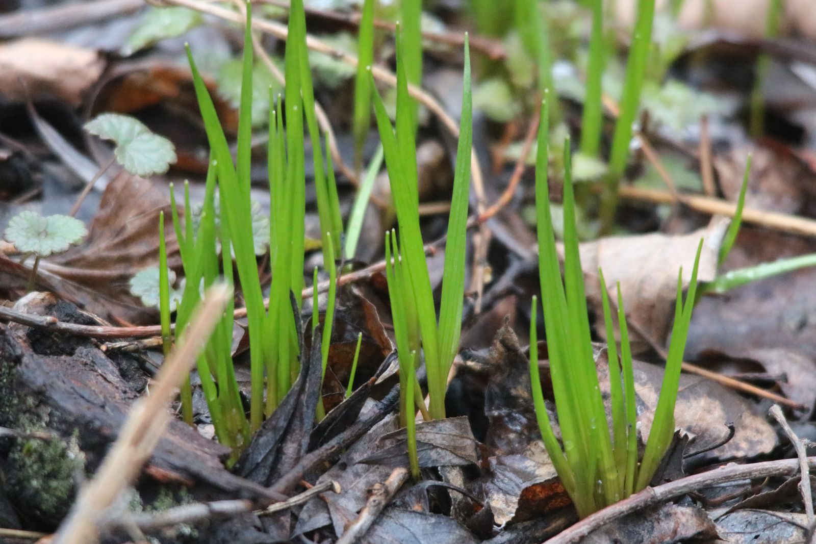 Словно зелёные флаги, сквозь сухую прошлогоднюю траву робко пробивается молодая зелень.